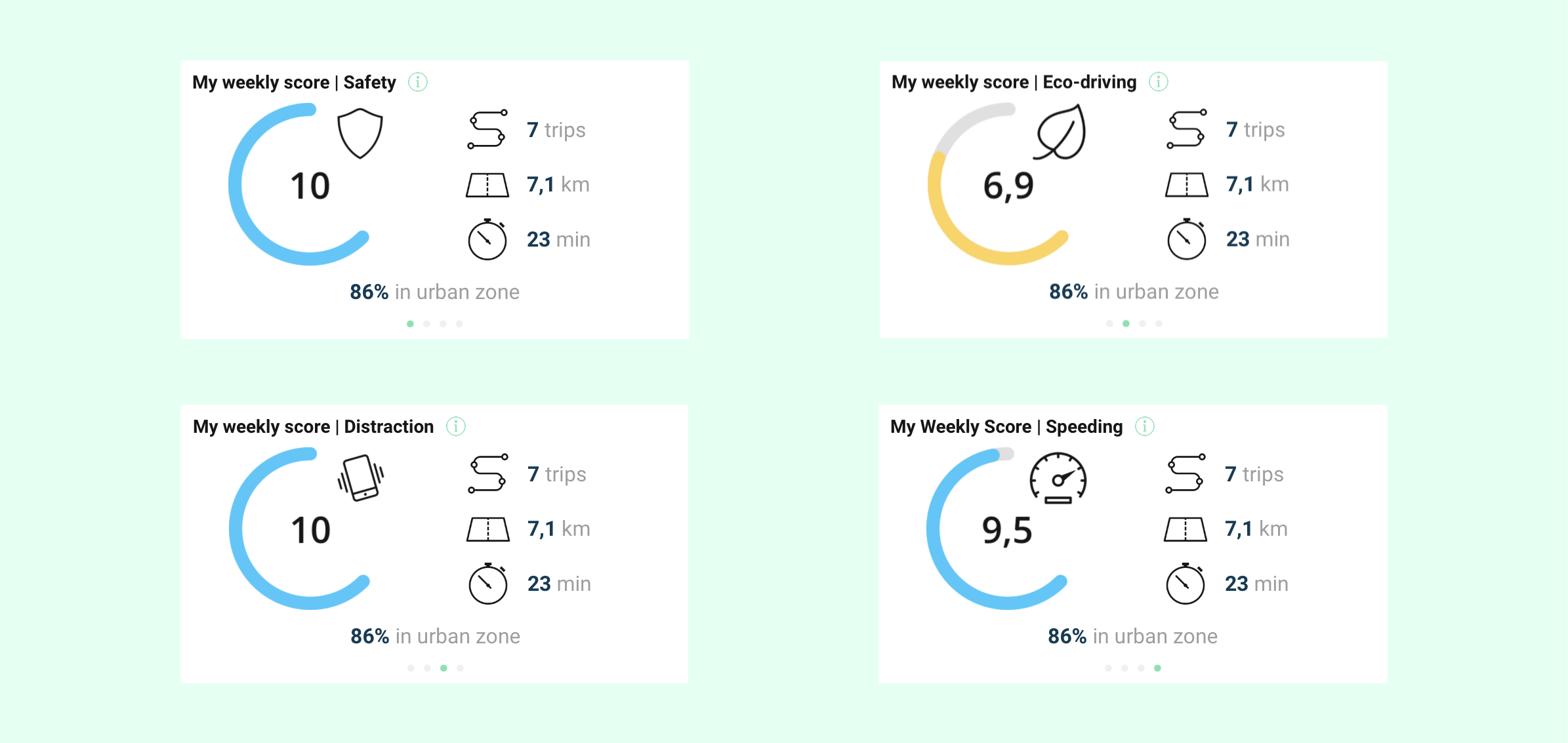 The synthesis scorecard shows as main information the averages of each of the driving scores calculated over a 7 days since the last trip date.